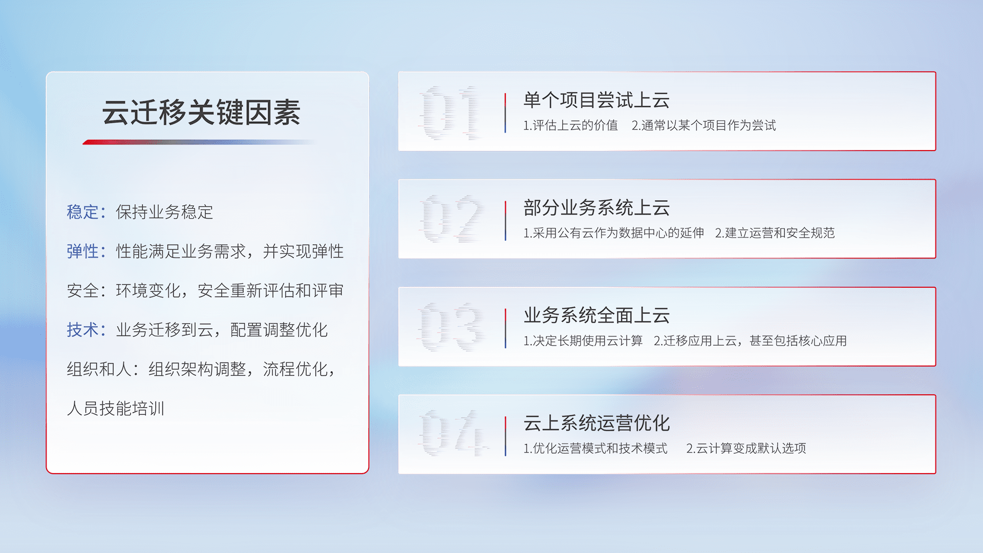 结合实际业务,,,从规划设计、、、云平台选型、、、、云原生改造、、、数据迁移、、集成交付,,,,迁移全过程为客户识别最佳上云路径,,,做好风险识别管理,,,,设计网络架构、、、、身份权限、、安全审计合规、、操作审计、、日志审计、、、监控告警策略、、多站点容灾设计等,,对云上基础设施进行整体规划,,提升IT治理水平,,,,以满足弹性、、高可用、、高性能的需求。。。