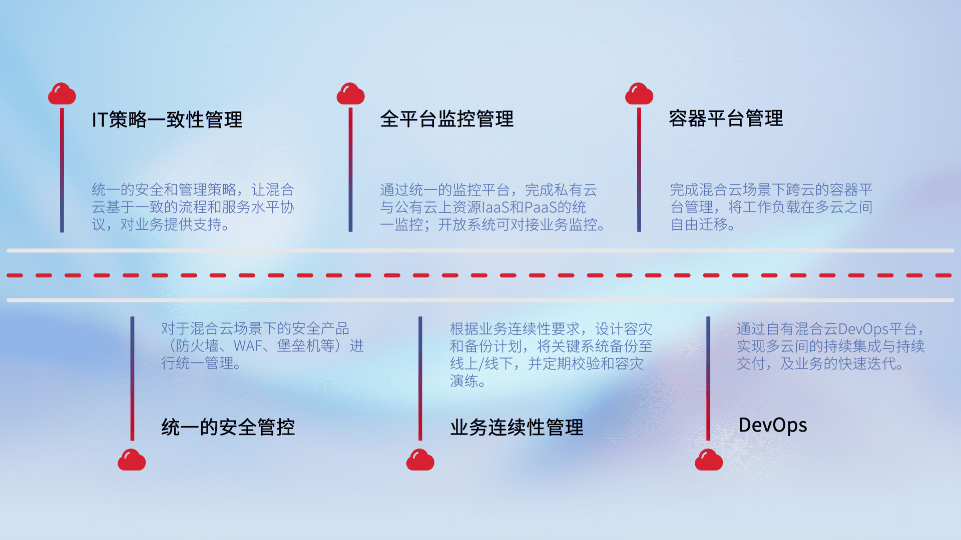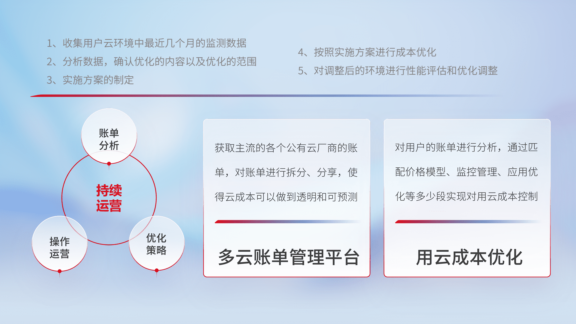 通过多云纳管,,以统一的资源数据模型把客户的云资源进行抽象和封装,,,,进而实现对多云资源的统一操作,,保障云资源管理的可靠性、、、稳定性与可用性。。量身定制化运维内容,,配置、、开发运维、、补丁管理、、、备份、、监控、、、认证和访问管理、、、、审计和日常巡检等,,,,保障在用云过程中的可靠度,,稳定度以及高可用率。。。