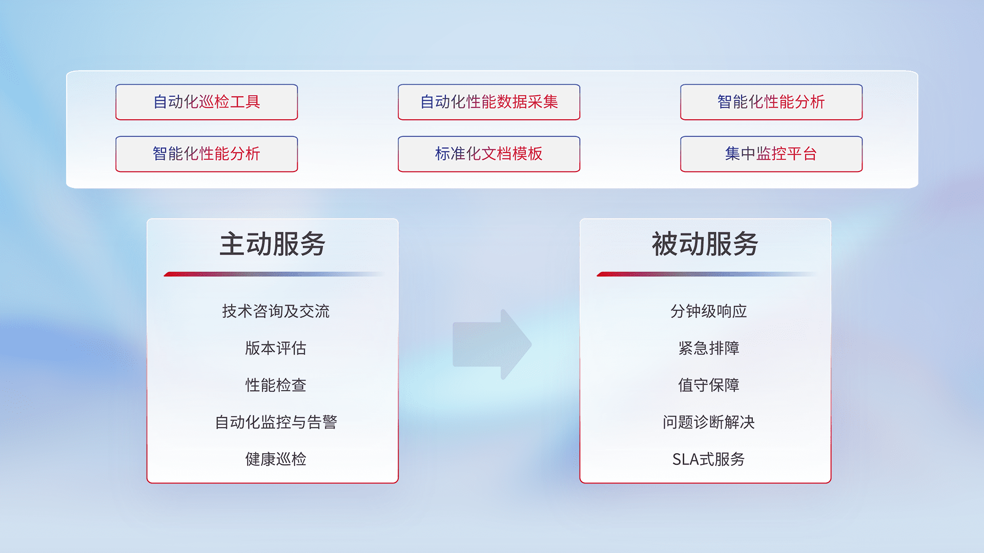 智能化工具和标准化文档,,,,保障服务质量,,,,提供主动服务(包含技术咨询、、版本评估、、性能检查、、、、自动化监控与告警、、、、健康巡检)和被动服务包含(分钟级响应、、、、紧急排障、、、、值守保障、、、问题诊断解决、、、、SLA服务)。。。。